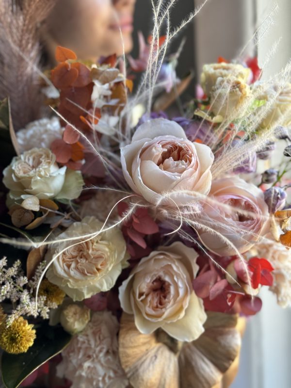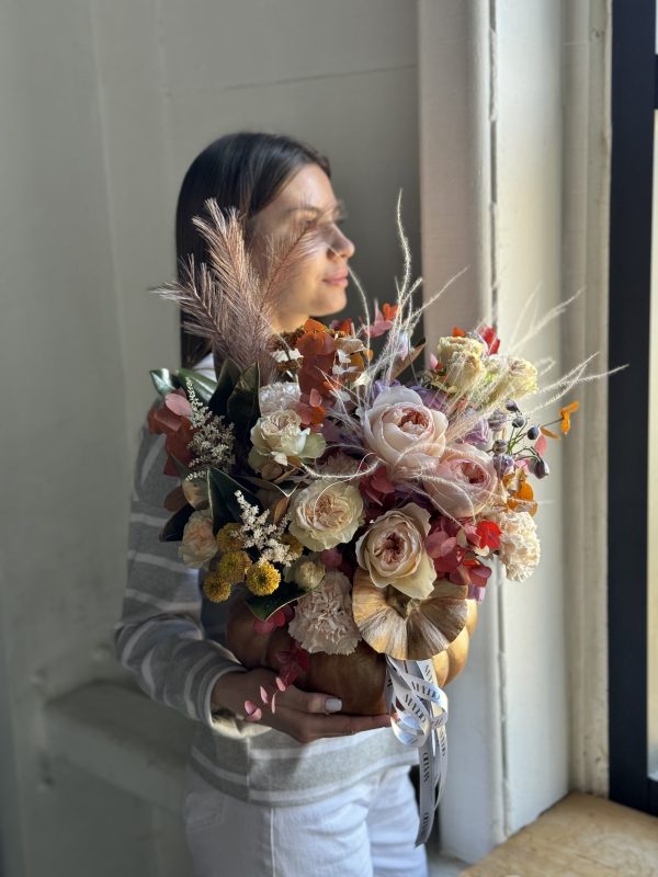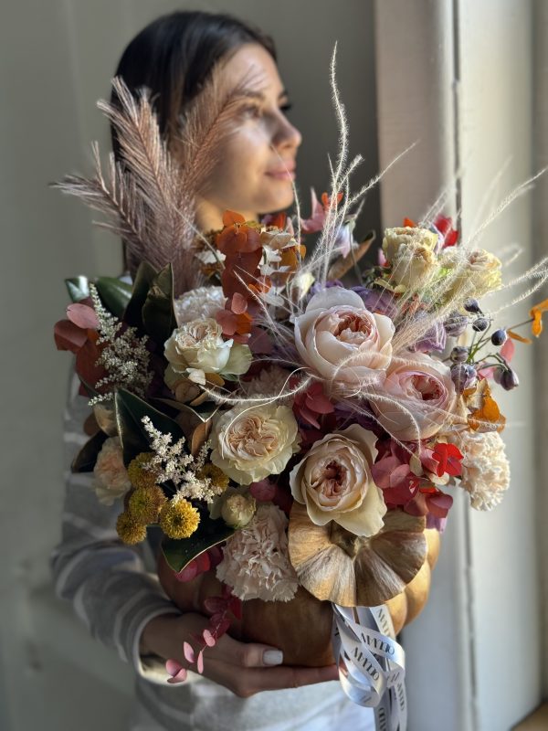 Описание: Композиция в тыкве с садовыми и кустовыми розами, дельфиниумами, диантусами, астильбами, ароматной маттиолой, кустовой хризантемой, миксом эвкалипта, листьями магнолии и сухоцветами.