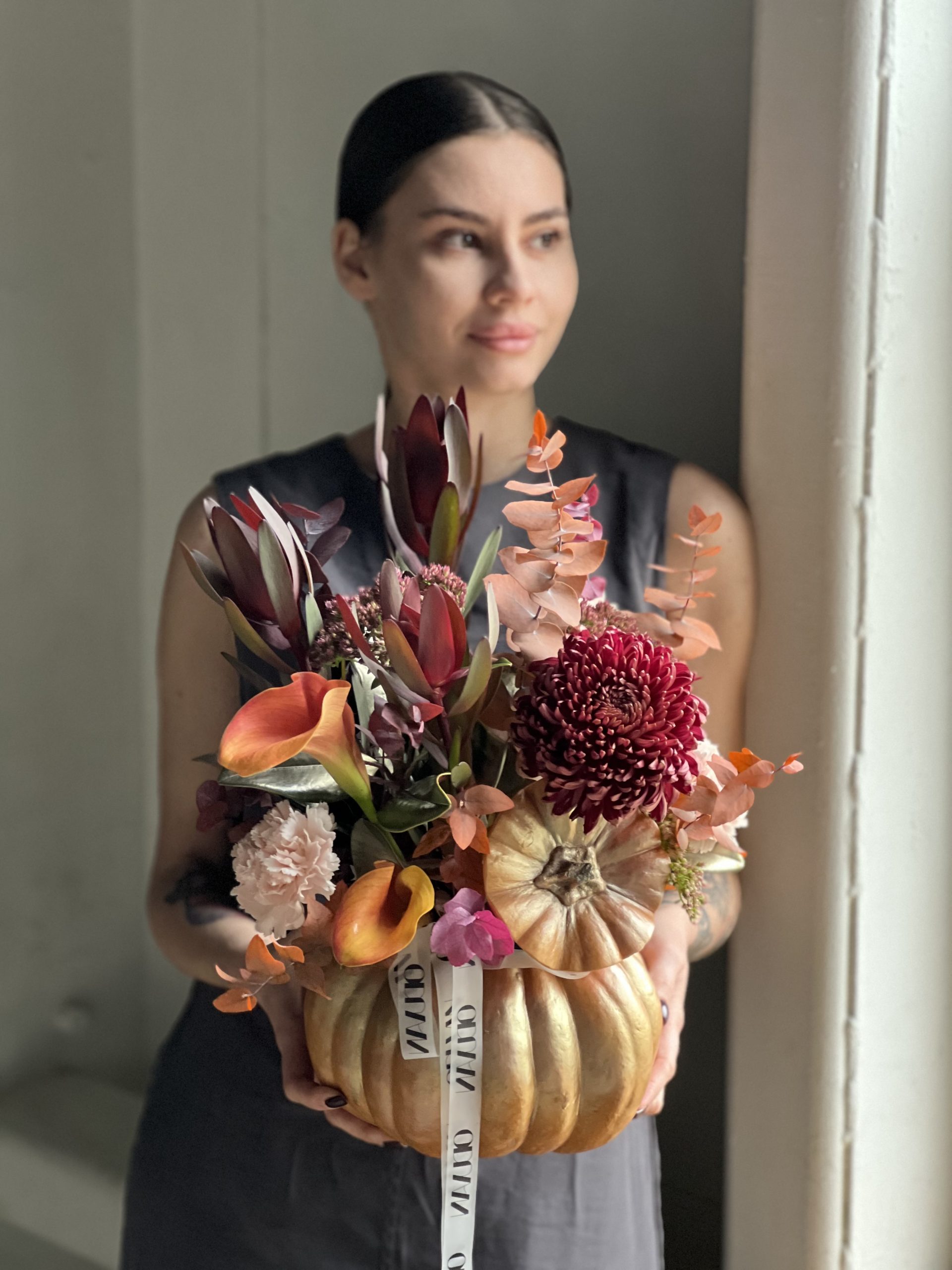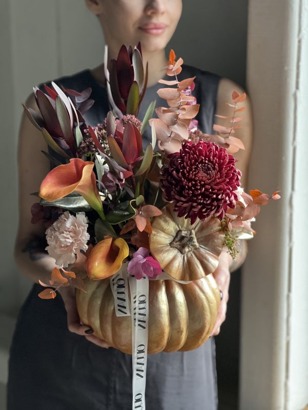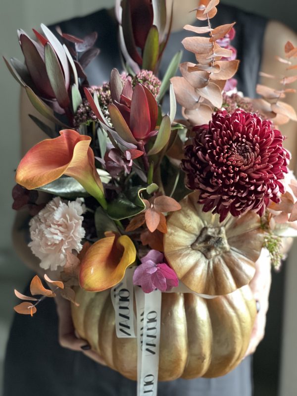 Описание: Композиция в тыкве с хризантемой Бигуди, каллами, леукаденронами, диантксами, седумом, листьями магнолии и стабилизированного эвкалипта.