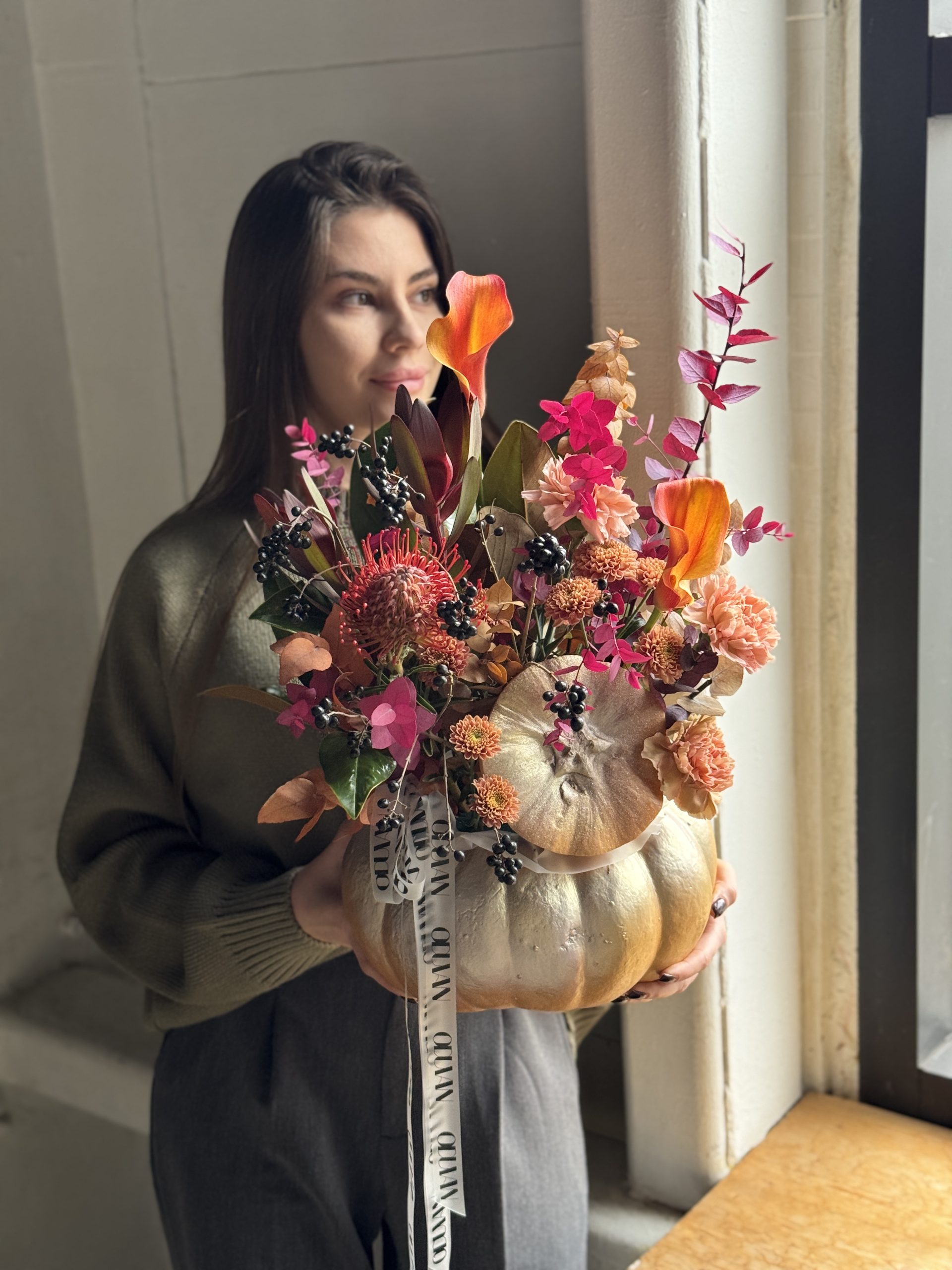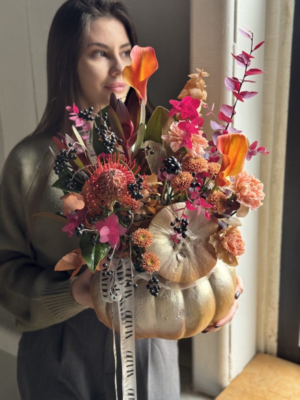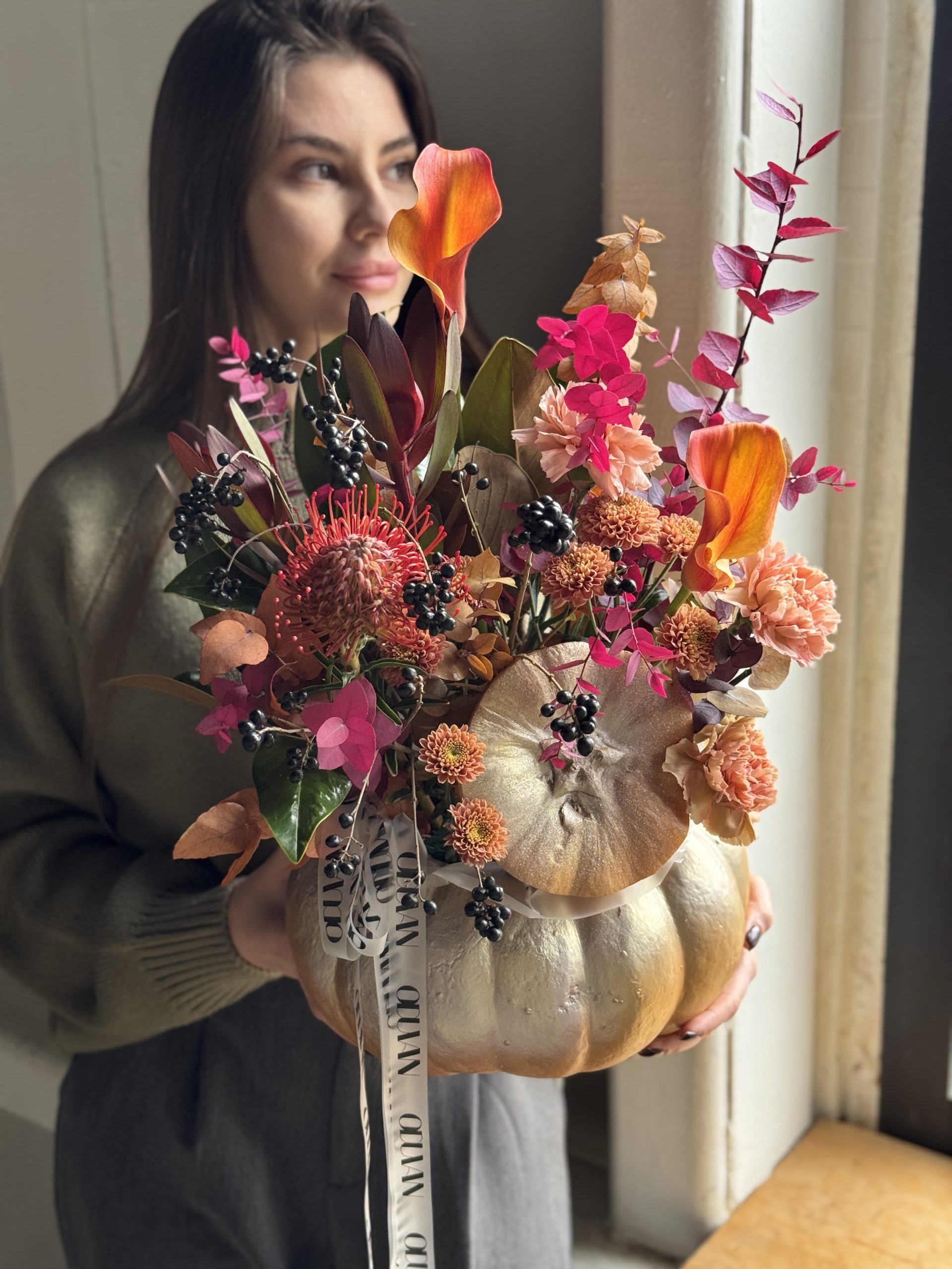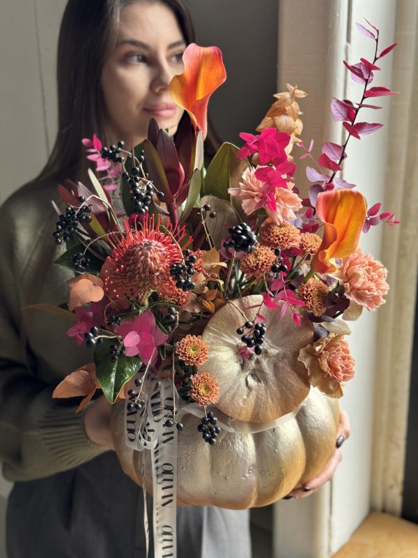 Описание: Композиция в тыкве с каллами, нутаном, леукаденроном, кустовыми хризантемами, диантусами, листьями магнолии, черными ягодами вибурнума и листьями стабилизированного эвкалипта.
