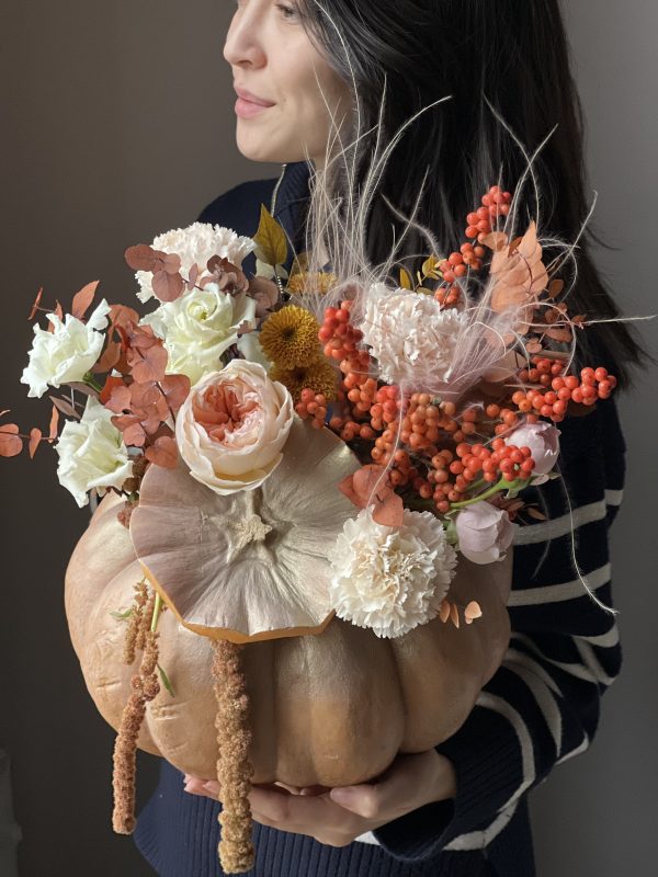 Описание: Сборная композиция в натуральной тыкве с пионовидной джульеттой, ягодами, астильбой, эустомой, кустовой хризантемой, диантусами, амарантом и эвкалиптом