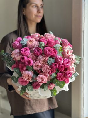 Описание: Сборная композиция в корзине с гортензиями, пионовидными садовыми розами, кустовыми пионовидными розами, пальмовыми листами, диантусами, ароматная маттиола, эустомой и эвкалиптом.