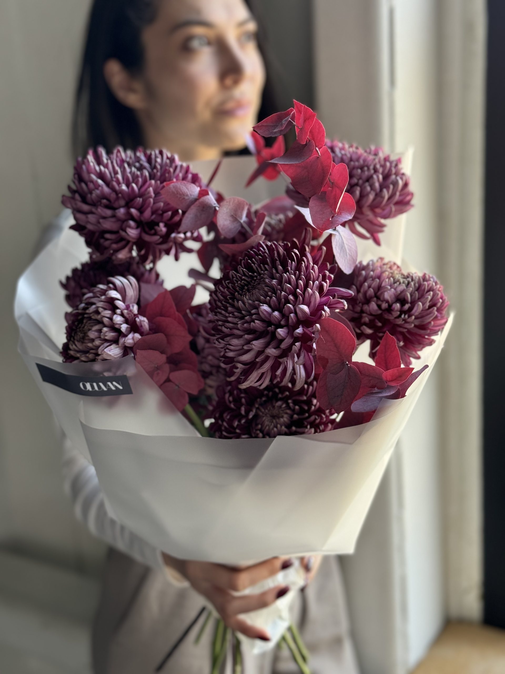 Описание: Букет с хризантемой Бигуди и эвкалиптом.
