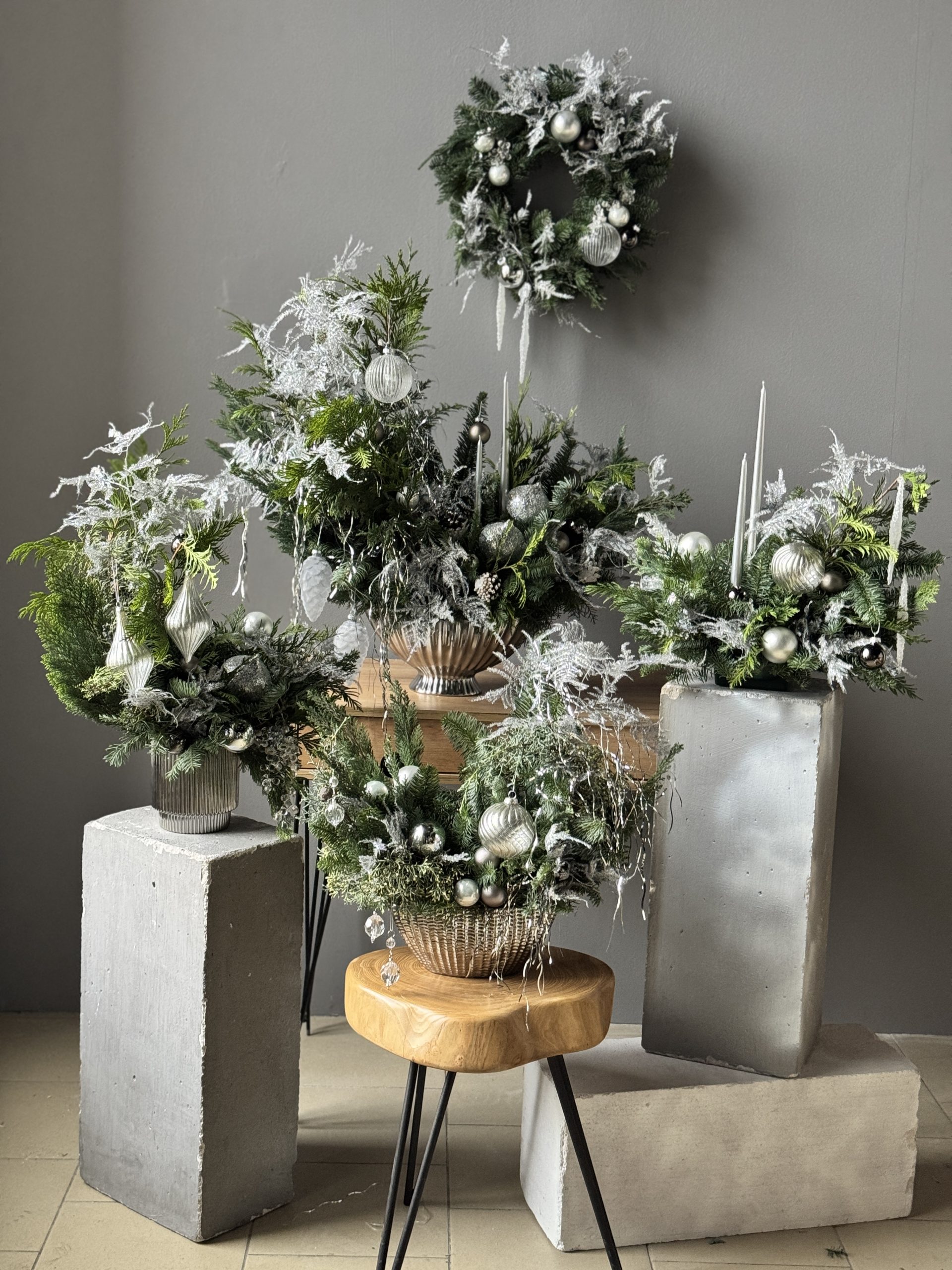 Состав: Новогодний сет с 4-мя настольными композициями и венком 35см.
