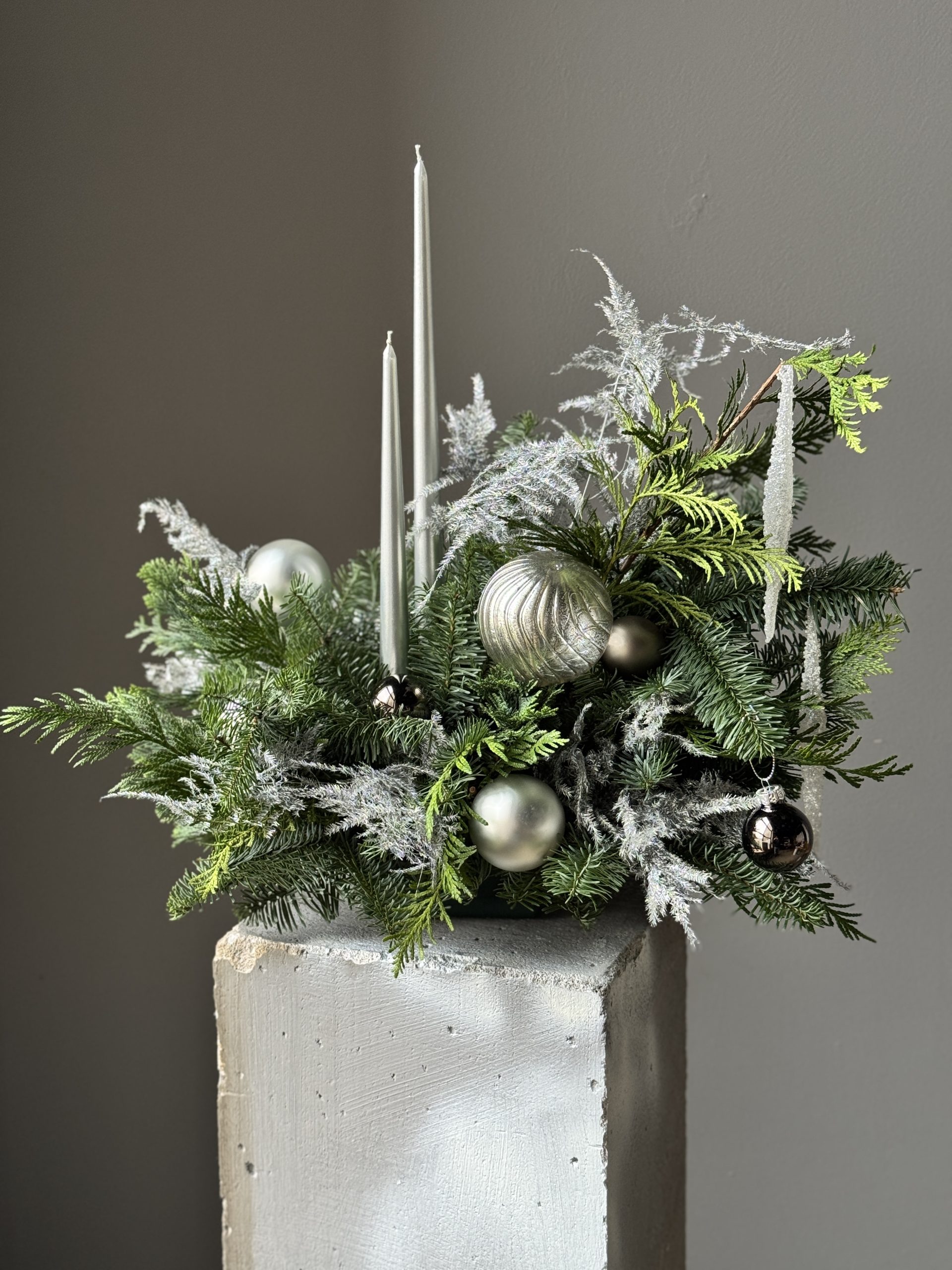 Для поддержания свежего вида хвои подливайте воду в центр композиции раз в 1-2 дня по мере высыхания губки, а также умеренно опрыскивайте пульверизатором.